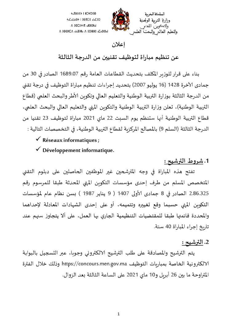 إعلان مباراة توظيف 23 تقنيين من الدرجة الثالثة