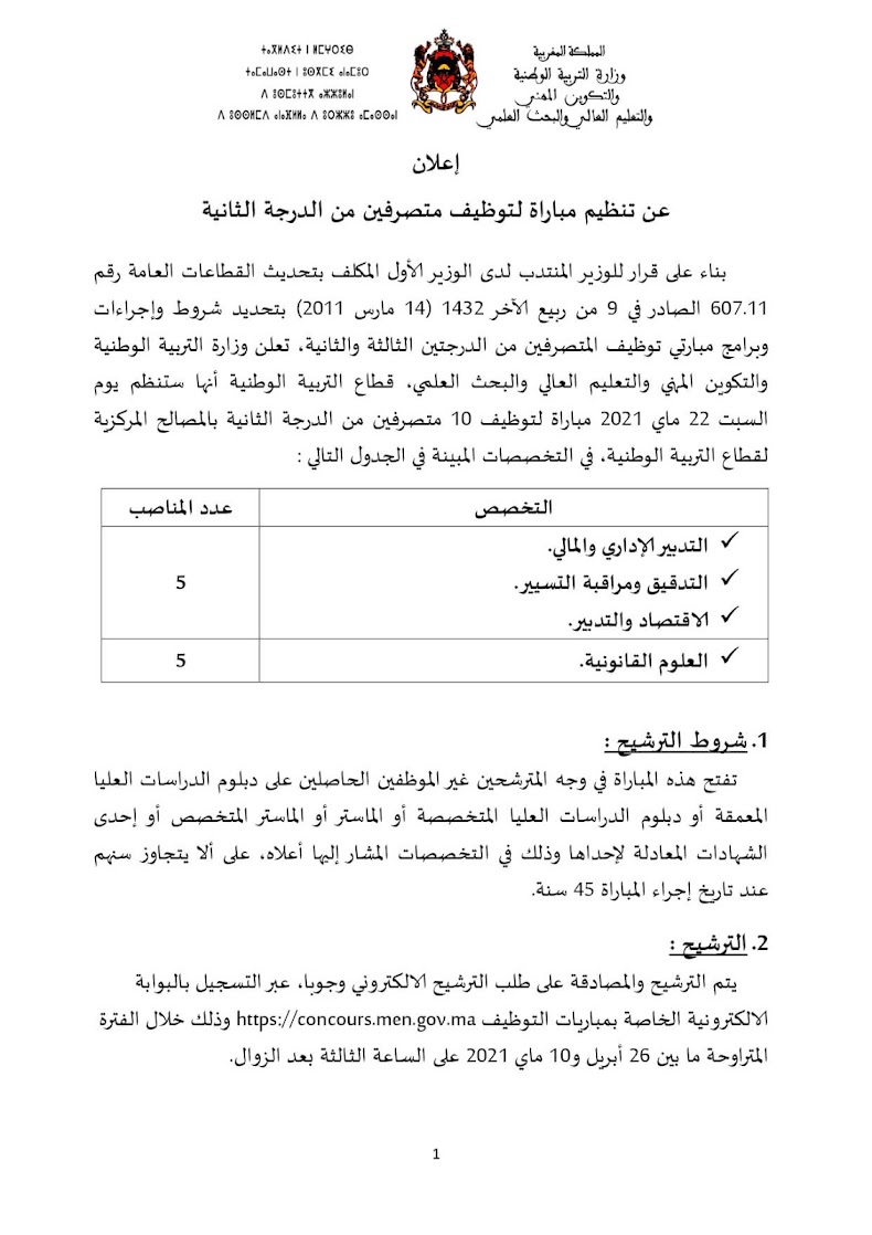 إعلان مباراة توظيف 10 متصرفين من الدرجة الثانية