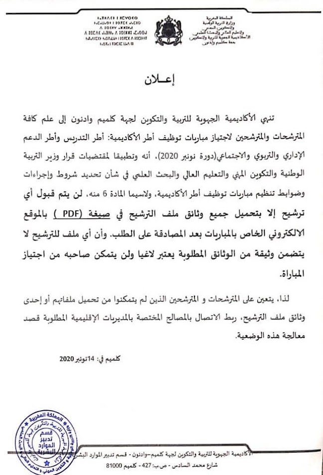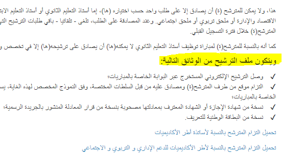 لايجب الضغط على الزر » ايداع ملف الترشيح » حتى تتاكدوا ان الوثائق الاربعة تم تحميلها ليست هناك امكانية التعديل بعد الضغط على الزر، أي ارسال لملف ناقص او فارغ يستوجب التوجه لحله عاجلا على مستوى المديرية المطلوبة .