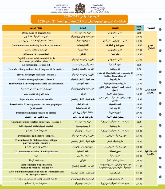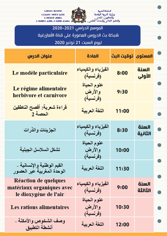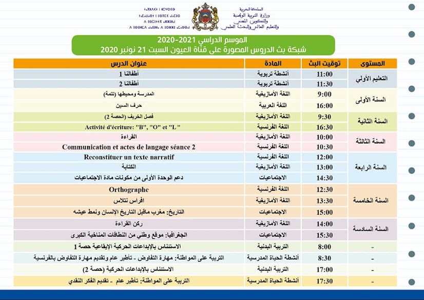 شبكة بث الدروس المصورة على قنوات الثقافية والأمازيغية والعيون ليومالسبت 21 نونبر 2020