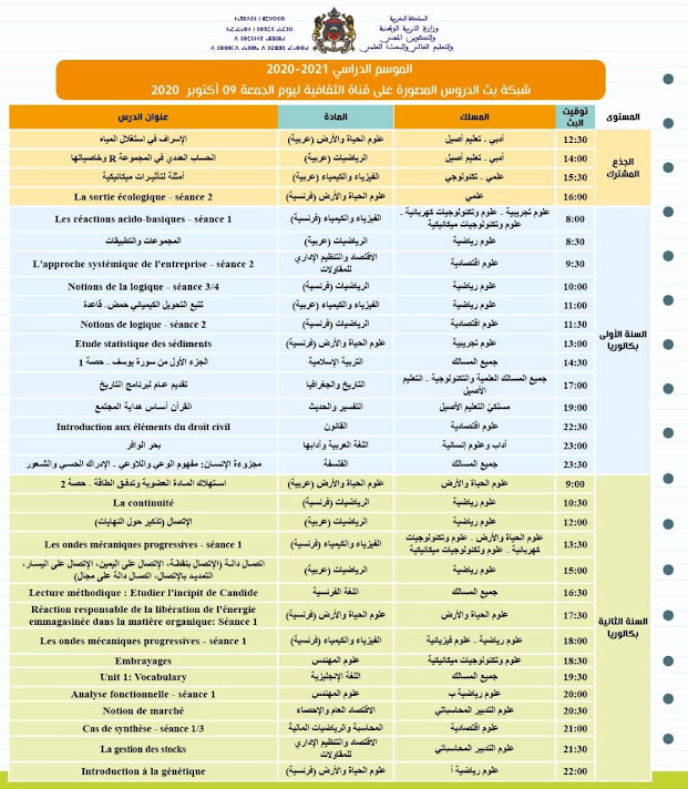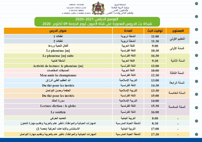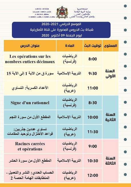 شبكة بث الدروس المصورة على قنوات الثقافية والأمازيغية والعيون ليوم الجمعة 09 أكتوبر 2020برنامج بث الدروس على قناة العيونبرنامج بث الدروس على قناة الأمازيغيةبرنامج بث الدروس على قناة الثقافية