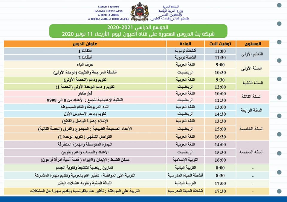 القائمة الرئيسية الصفحات شبكة بث الدروس المصورة على قنوات الثقافية والأمازيغية والعيون ليوم الأربعاء 11 نونبر 2020برنامج بث الدروس على قناة العيونبرنامج بث الدروس على قناة الأمازيغيةبرنامج بث الدروس على قناة الثقافية أخر المواضيع من قسم : البرمجة المفصلة لبث دروس مواضيع الساعة