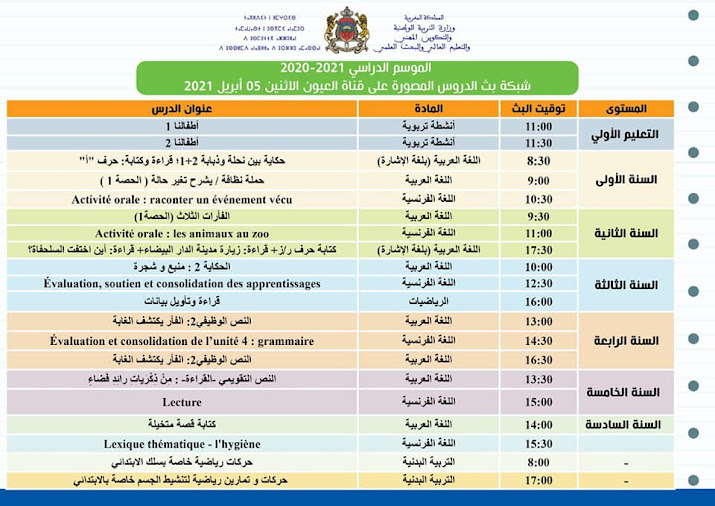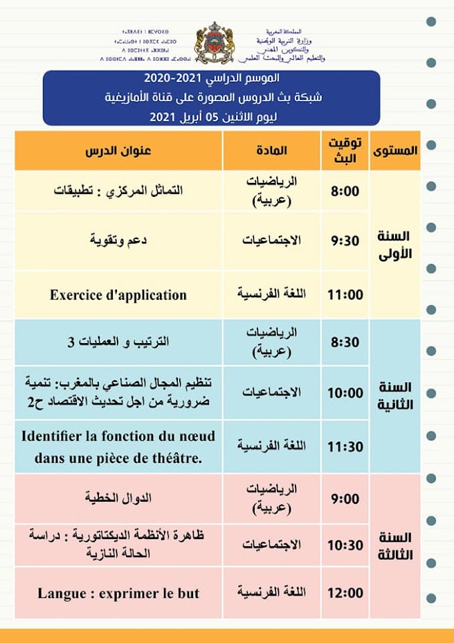 شبكة بث الدروس المصورة على قنوات الثقافية والأمازيغية والعيون ليوم الاثنين 05 أبريل 2021
