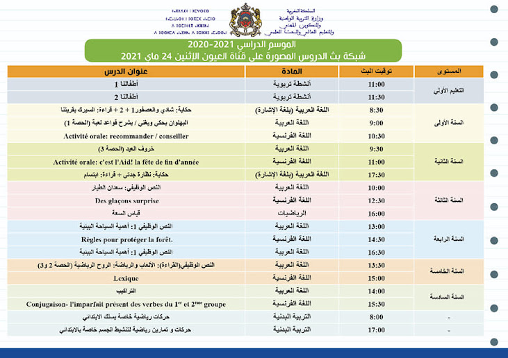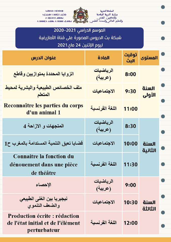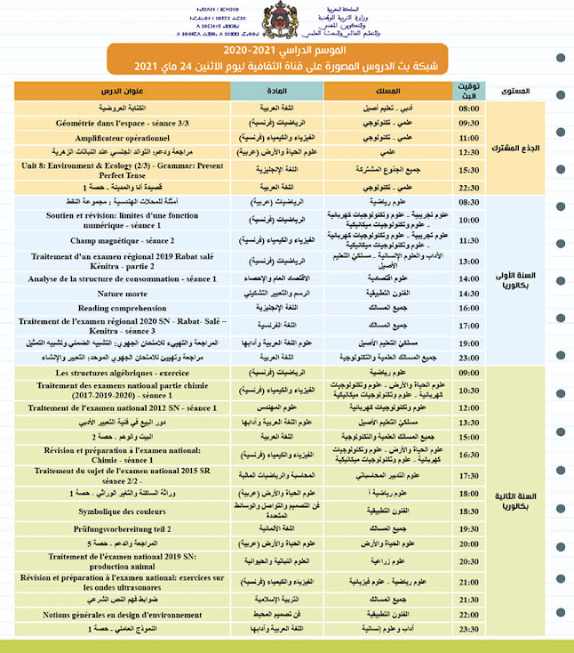 شبكة بث الدروس المصورة على قنوات الثقافية والأمازيغية والعيون ليوم الاثنين 24 ماي2021
