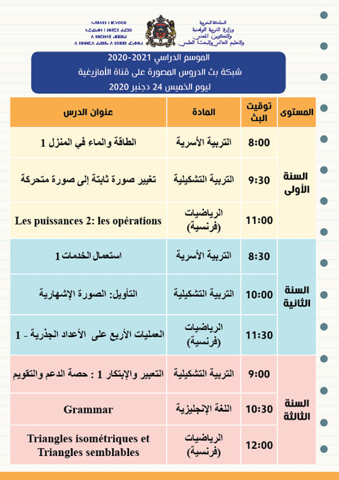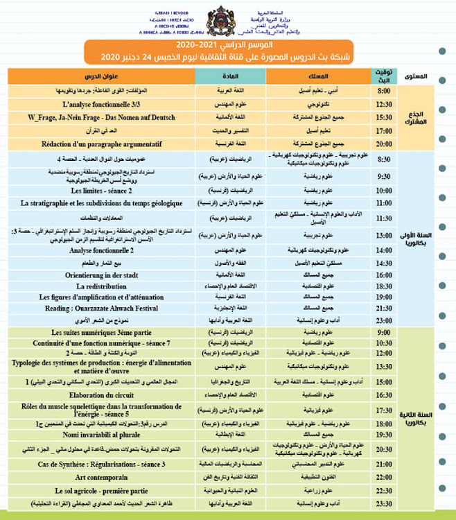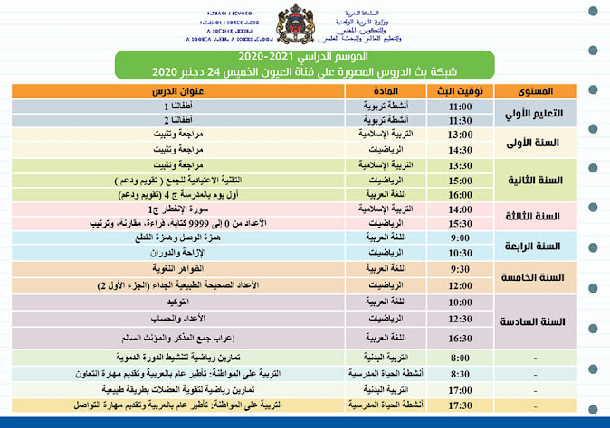 شبكة بث الدروس المصورة على قنوات الثقافية والأمازيغية والعيون ليوم الخميس 24 دجنبر 2020