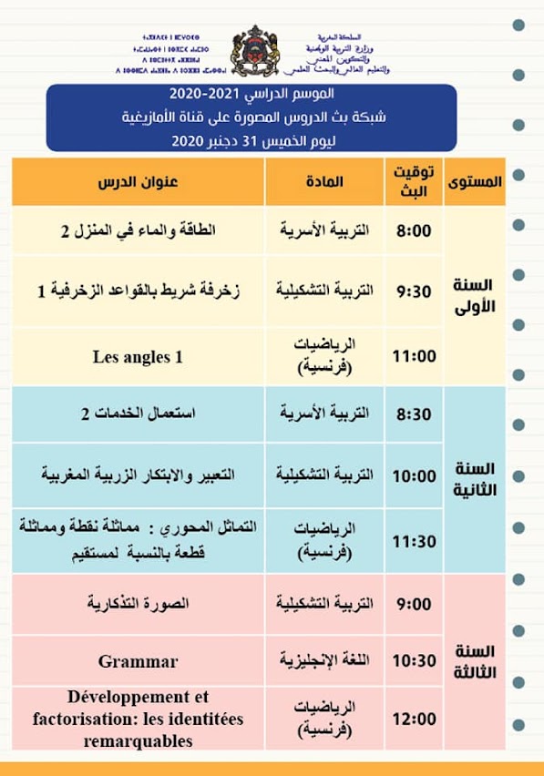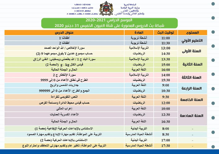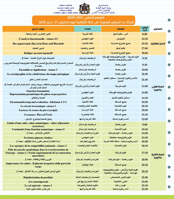 شبكة بث الدروس المصورة على قنوات الثقافية والأمازيغية والعيون ليوم الخميس31 دجنبر 2020
