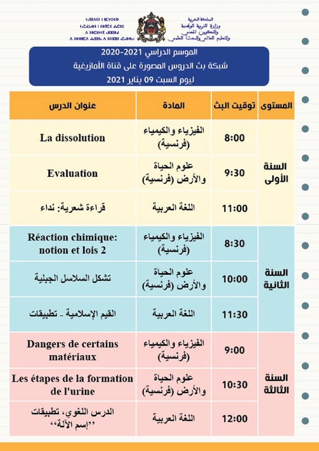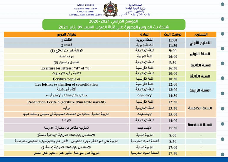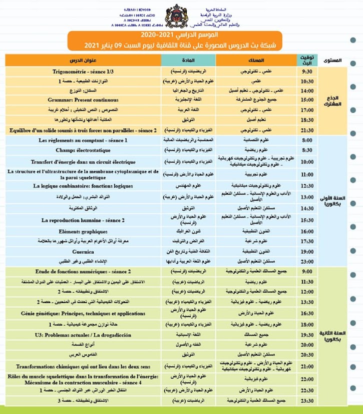 شبكة بث الدروس المصورة على قنوات الثقافية والأمازيغية والعيون ليوم السبت 09 يناير 2021