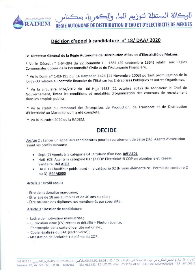 Six (06) Agents d’exécution à la catégorie 03 ayant niveau de l’enseignement secondaire qualifiant (tronc commun, 1ère année ou 2ème année du Bac) plus un diplôme de CQP en plomberie ou en Installation Thermique et Sanitaire.