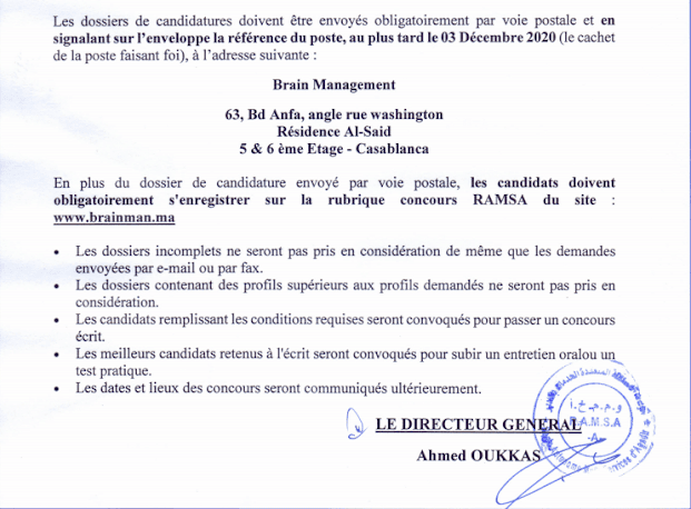 Un (01) Cadre Administratif à la catégorie 11 ayant un diplôme de l’ISCAE, l’ENCG, Master (BAC+5) ou tout autre diplôme équivalent reconnu par l’Etat en Gestion des Ressources Humaines.