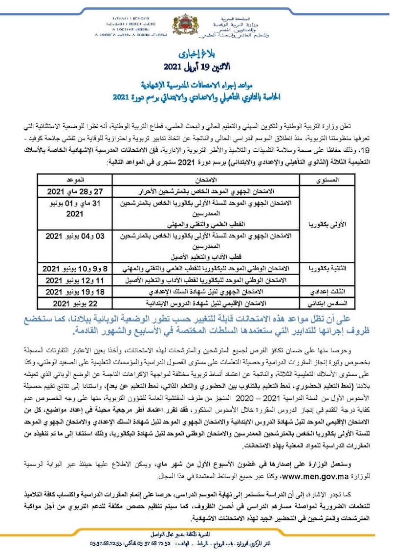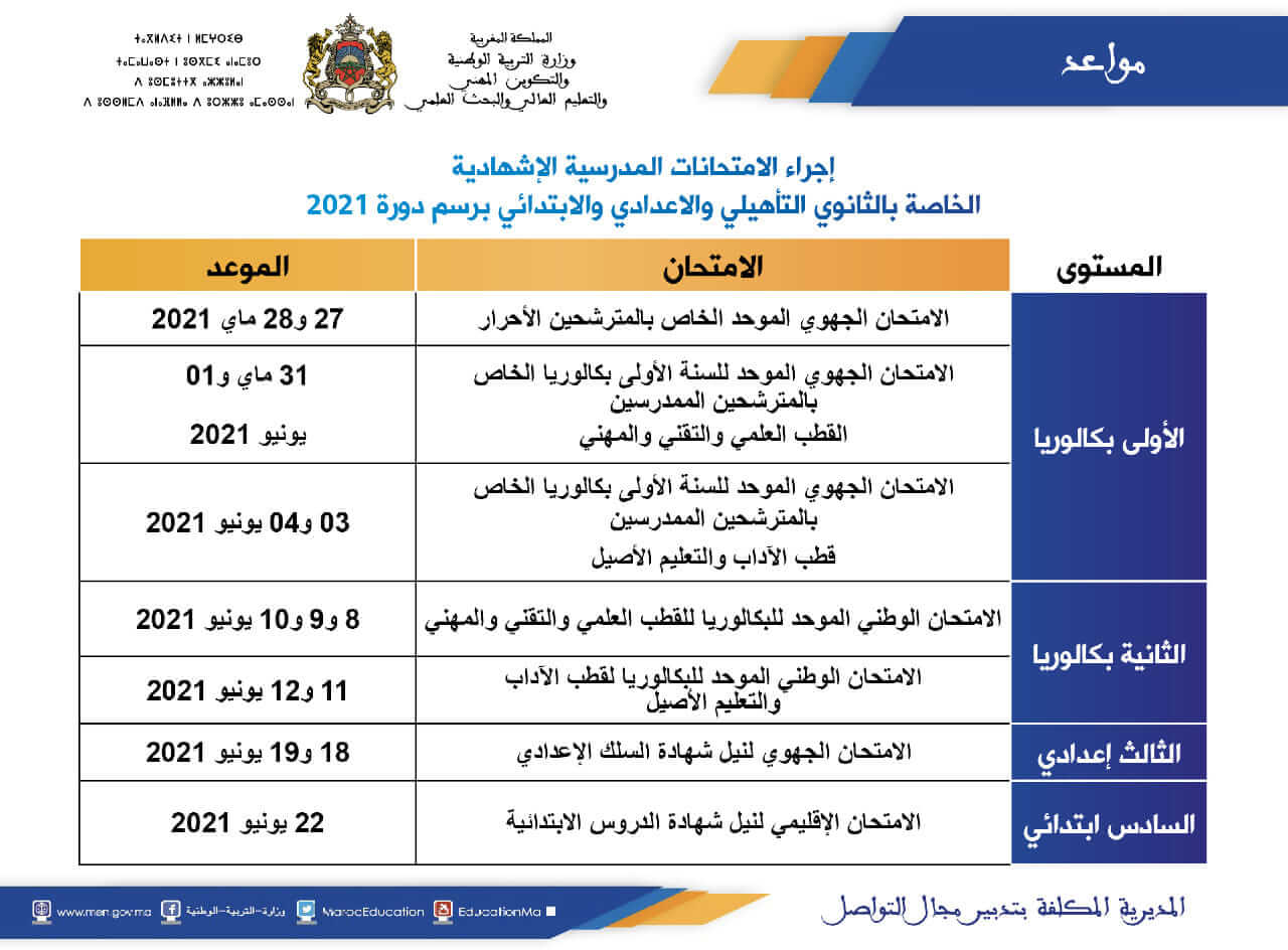 تعلن وزارة التربية الوطنية والتكوين المهني والتعليم العالي والبحث العلمي، قطاع التربية الوطنية، أنه نظرا للوضعية الاستثنائية التي تعرفها منظومتنا التربوية، منذ انطلاق الموسم الدراسي الحالي والناتجة عن اتخاذ تدابير تربوية واحترازية للوقاية من تفشي جائحة كوفيد – 19، وذلك حفاظا على صحة وسلامة التلميذات والتلاميذ والأطر التربوية والإدارية، فإن الامتحانات المدرسية الإشهادية الخاصة بالأسلاك التعليمية الثلاثة (الثانوي التأهيلي والإعدادي والابتدائي) برسم دورة 2021 ستجرى في المواعد التالية: