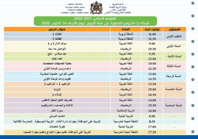 شبكة بث الدروس المصورة على قنوات الثقافية والأمازيغية والعيون ليوم الأربعاء 14 أكتوبر 2020برنامج بث الدروس على قناة العيونبرنامج بث الدروس على قناة الأمازيغيةبرنامج بث الدروس على قناة الثقافية