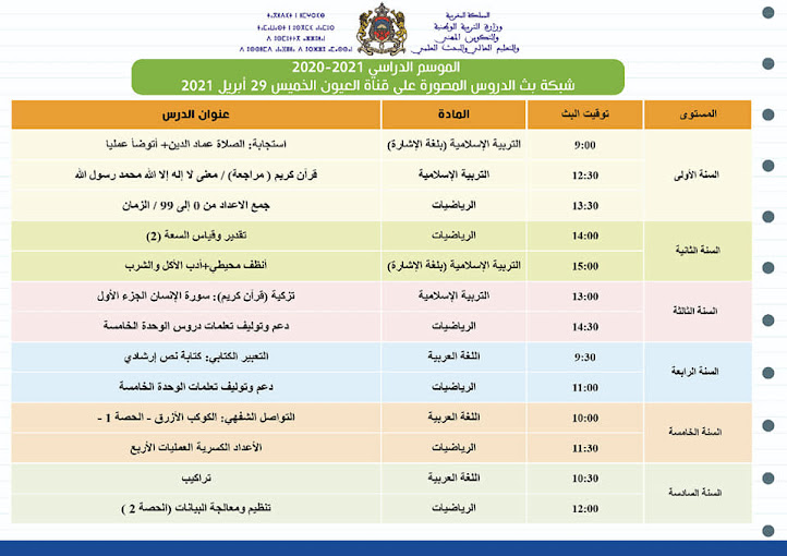 شبكة بث الدروس المصورة على قنوات الثقافية والأمازيغية والعيون ليوم  الخميس 29 أبريل2021