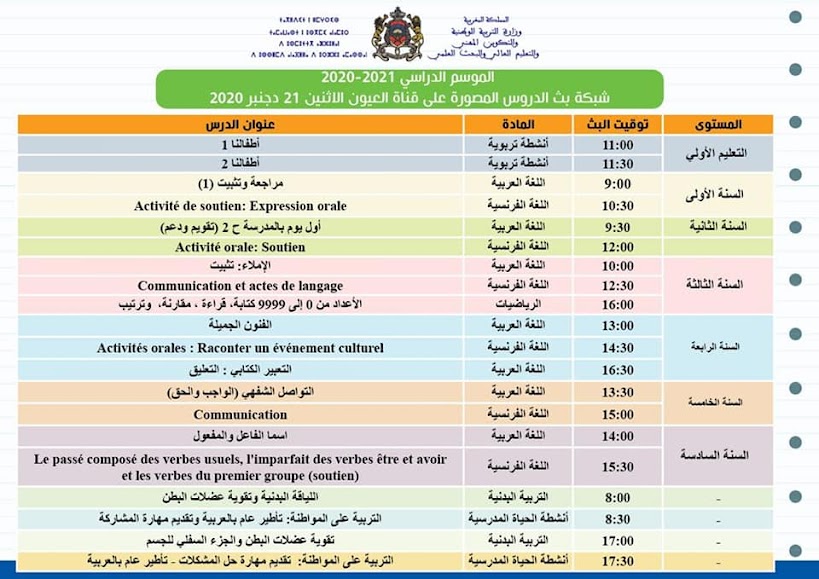 شبكة بث الدروس المصورة على قنوات الثقافية والأمازيغية والعيون ليوم الاثنين 21 دجنبر 2020
