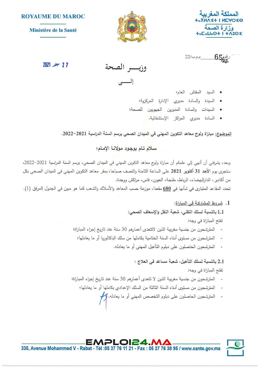 مباراة معاهد التكوين المهني في الميدان الصحي 2021 ifps.sante.gov.ma ، الاعلان عن مباراة معاهد التكوين المهني في الميدان الصحي 2021-2022 * شعبة النقل والإسعاف الصحي * شعبة مساعد في العلاج التسجيل بين 08 و15 أكتوبر 2021.