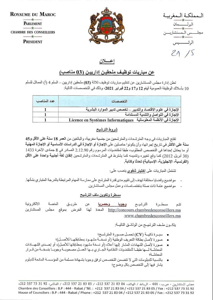 تتـم مسطــرة الترشيــح وجوبا وحصريا عن طريــق المنصة الالكترونية http://concours.chambredesconseillers.ma المعدة لهذا الغرض بموقع مجلس المستشارين www.chambredesconseillers.ma